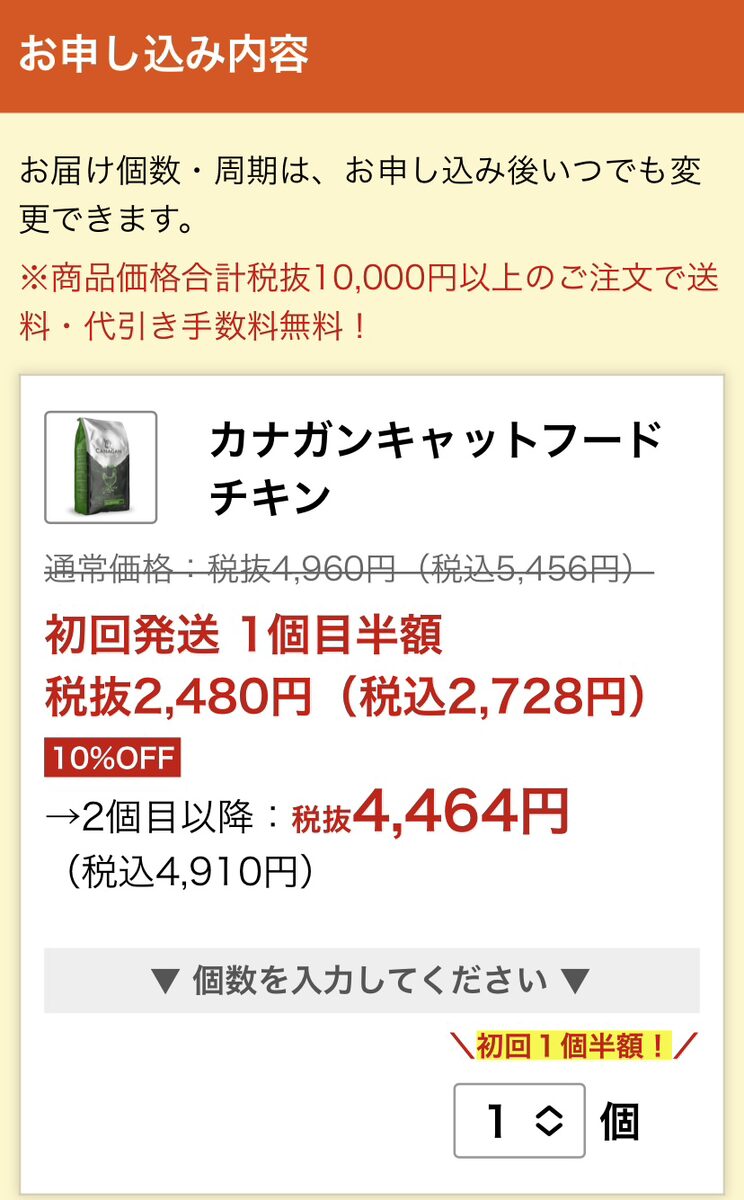 定期コースでは常に10%オフの価格でカナガンキャットフードを購入できますが、注文する個数を増やすとさらに割引率もアップします。