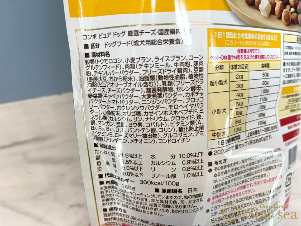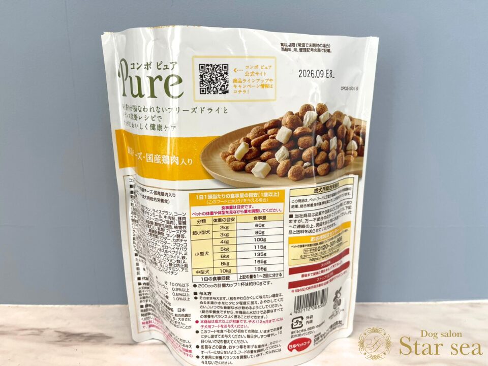 ※今回は「コンボ ピュア ドッグ 厳選チーズ・国産鶏肉入り」の表記です。