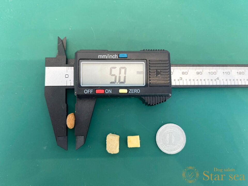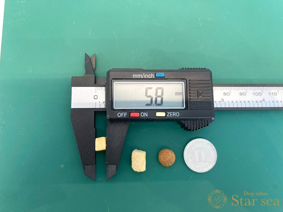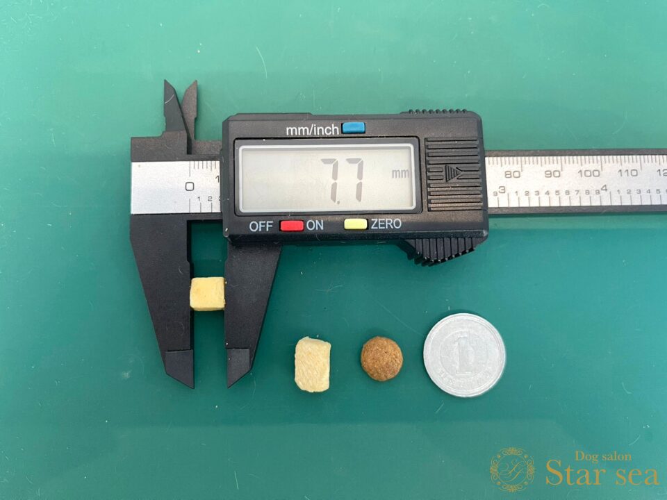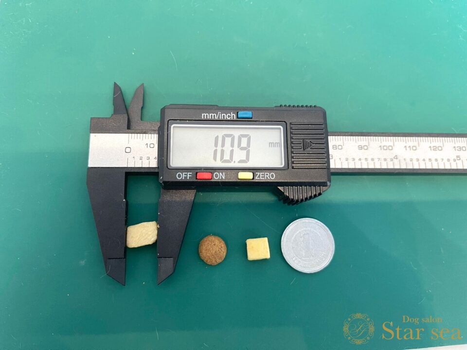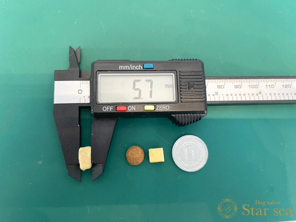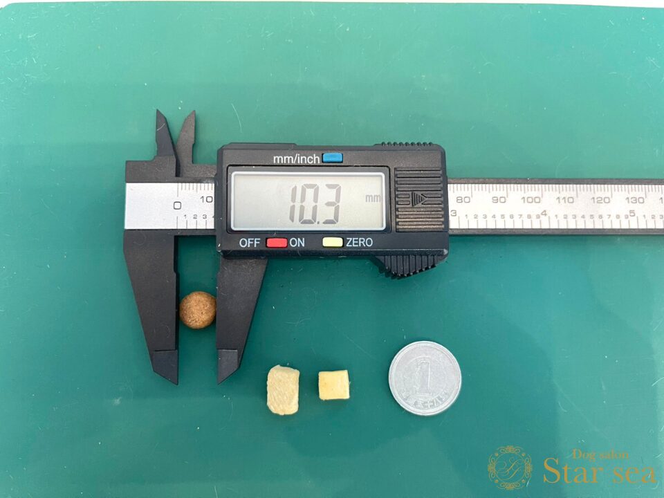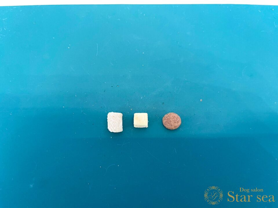 フードの粒に比べるとやや大きめですが、硬さはなく柔らかいので、もし大きいと感じる場合でも簡単に砕いて与えることができます。