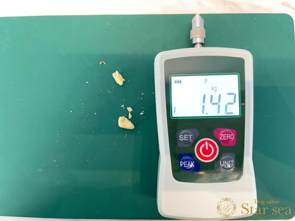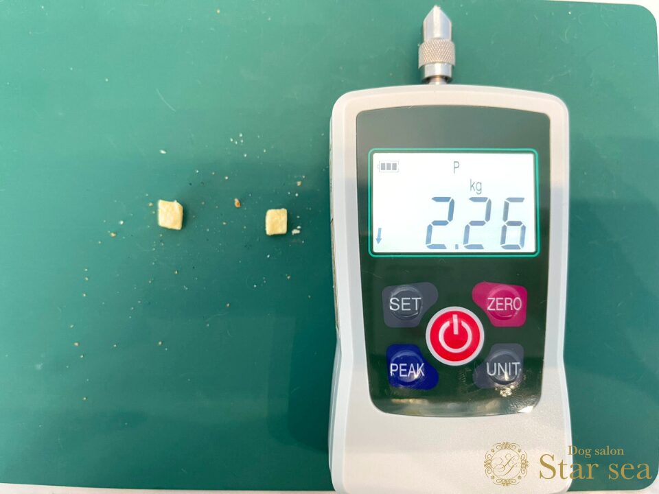 ドッグフード・チーズ・鶏肉をそれぞれ大きさと硬さを測定しました。