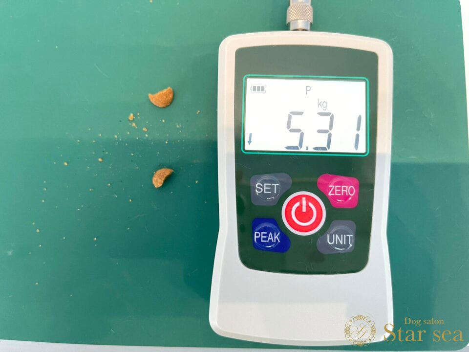 コンボピュアドッグフードの粒の大きさは10.3㎜、厚さは5.0㎜、硬さは5.31㎏でした。
