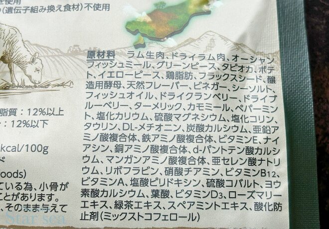 - ラム生肉、ドライラム肉、オーシャンフィッシュミール、グリーンピース、タピオカ、ポテト、イエローピース、鶏脂肪、フラックスシード、醸造用酵母、天然フレーバー、ビネガー、シーソルト、フィッシュオイル、ドライクランベリー、ドライブルーベリー、ターメリック、カモミール、ペパーミント、塩化カリウム、硫酸マグネシウム、塩化コリン、タウリン、DL-メチオニン、炭酸カルシウム、亜鉛アミノ酸複合体、鉄アミノ酸複合体、ビタミンE、ナイアシン、銅アミノ酸複合体、d-パントテン酸カルシウム、マンガンアミノ酸複合体、亜セレン酸ナトリウム、リボフラビン、硝酸チアミン、ビタミンB12、ビタミンA、塩酸ピリドキシン、硫酸コバルト、ヨウ素酸カルシウム、葉酸、ビタミンD3、ローズマリーエキス、緑茶エキス、スペアミントエキス、酸化防止剤(ミックストコフェロール)