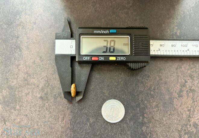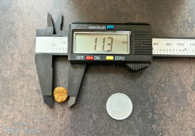 粒の大きさを測定すると直径11.3ミリ、厚さは3.8mmとなっています。超小型犬だと少し大きく感じるかもしれませんが、食べることはできるでしょう。