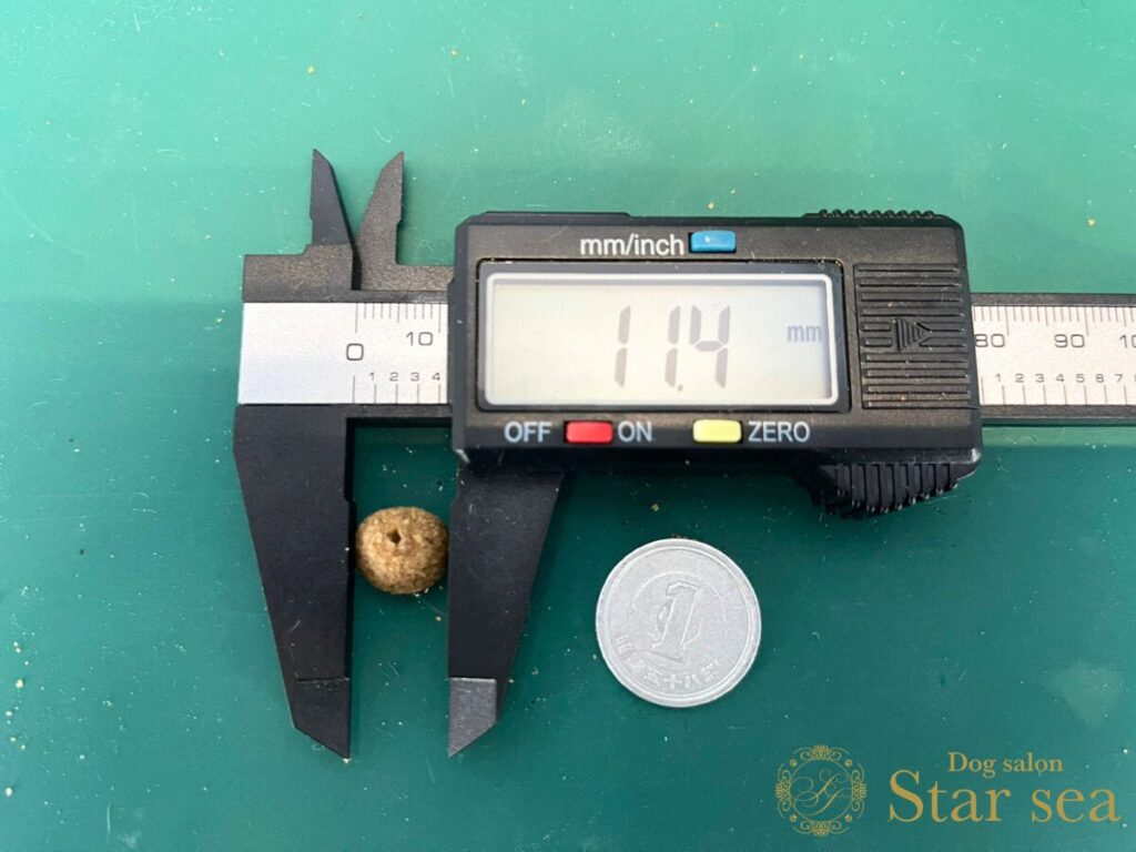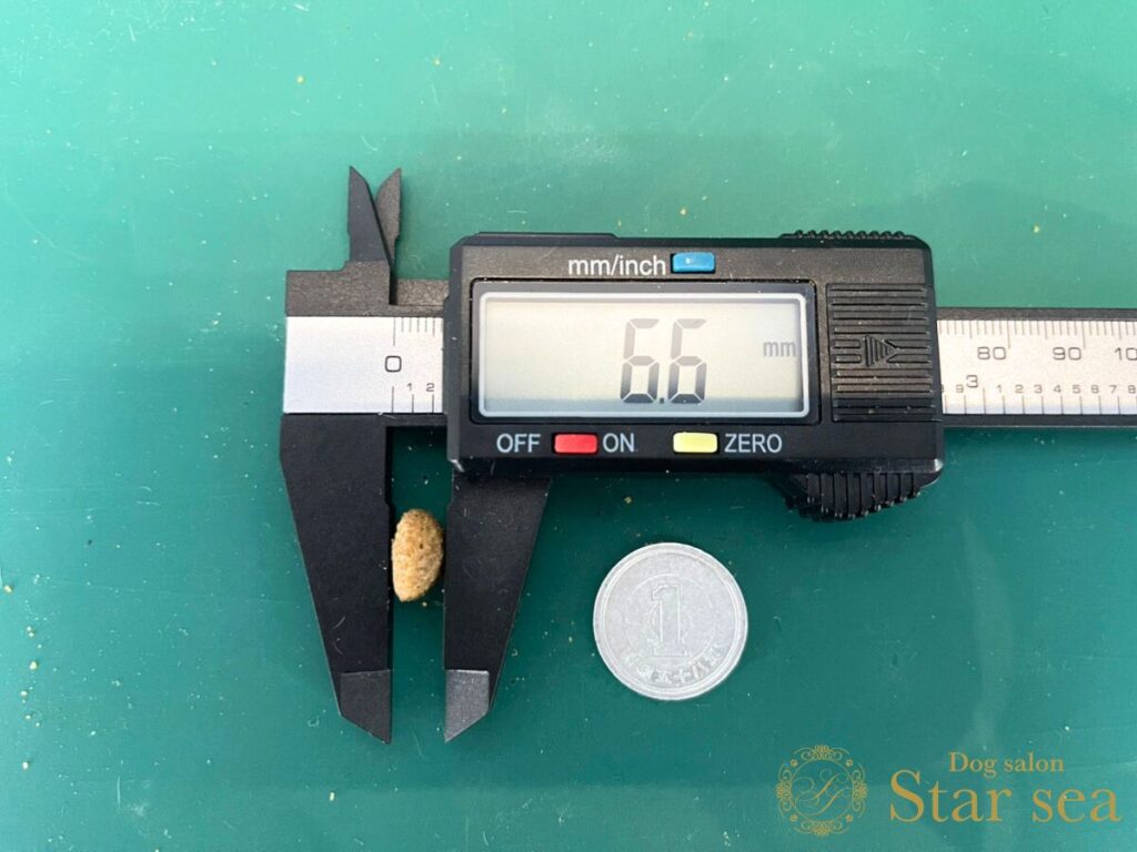 アナメイトドッグフードの大きさを測定したところ、大きさは11.4㎜、幅は6.6㎜でした。