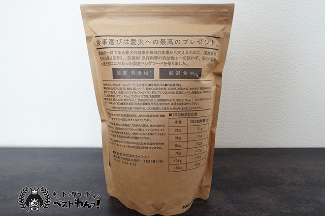 背面には必要最低限の情報と、上部には安心犬活ドッグフードの特徴が記載されています。