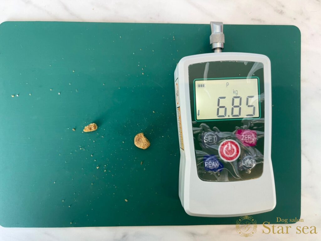 硬度測定器で粒の硬さを測定してみたところ、一般的なフードと比べて固めでした。