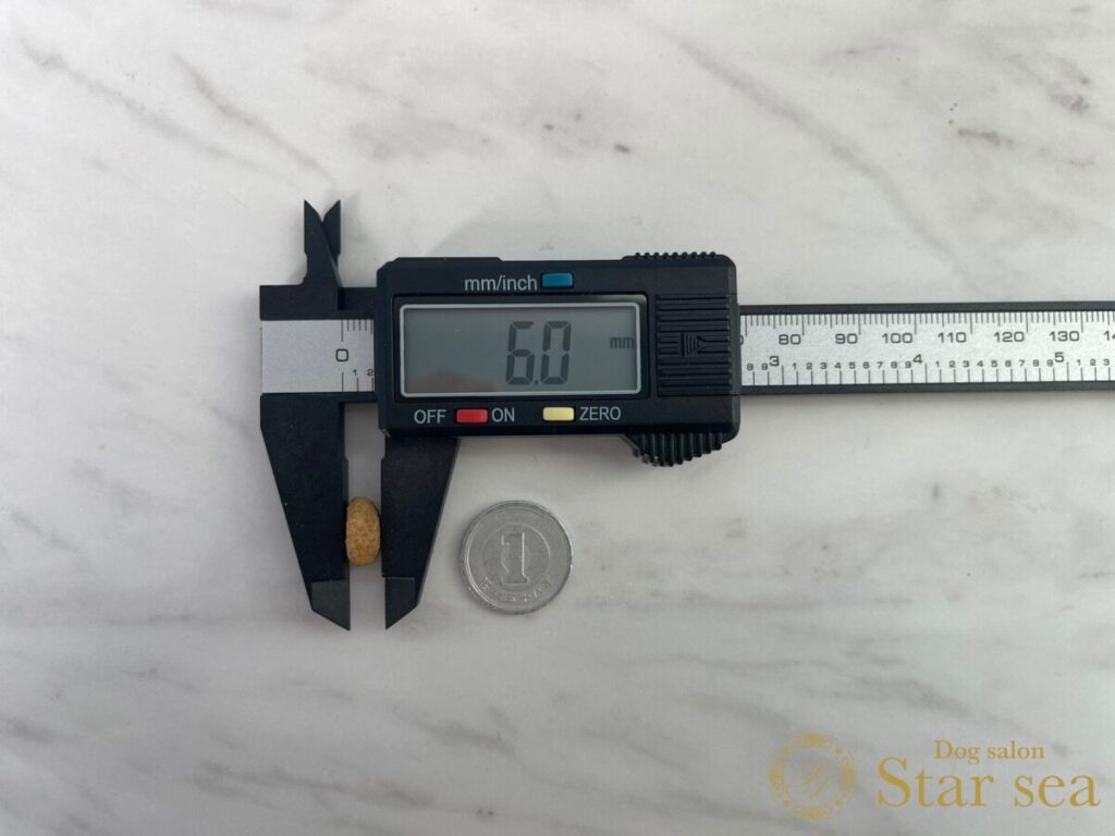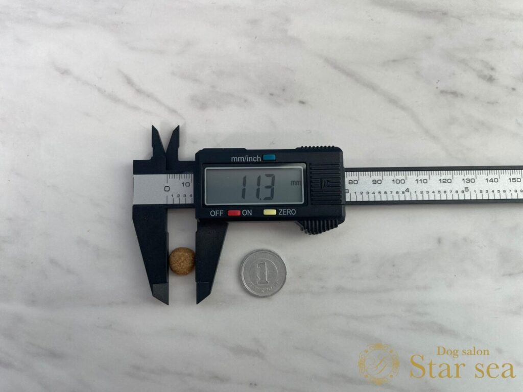 「ビタワン」の粒の大きさを測定したところ、直径11.3㎜、厚さ6.0㎜でした。