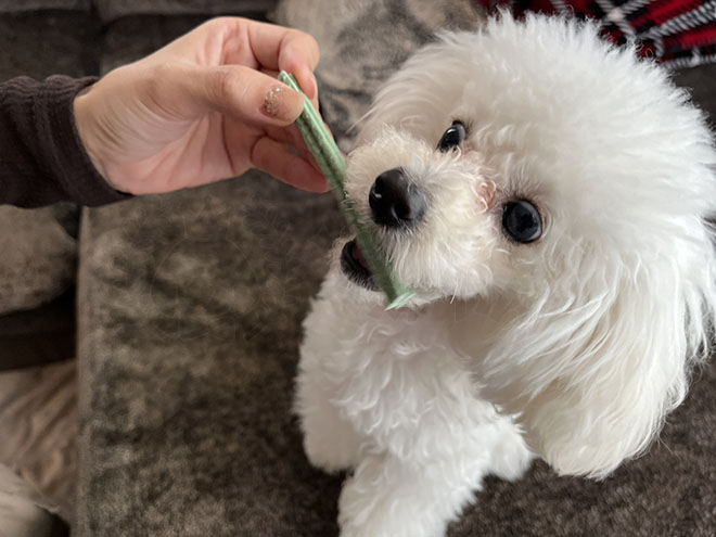 「これを食べるだけで口臭が改善する!・歯石が取れる!」といった商品もよく見られますが、プロの目線で言うと口臭ケアの基本は歯磨きであり、飼い主さんがこまめに愛犬の歯磨きをしない限り口臭の改善は難しいと思います(※原因が内臓疾患の場合を除く)。
