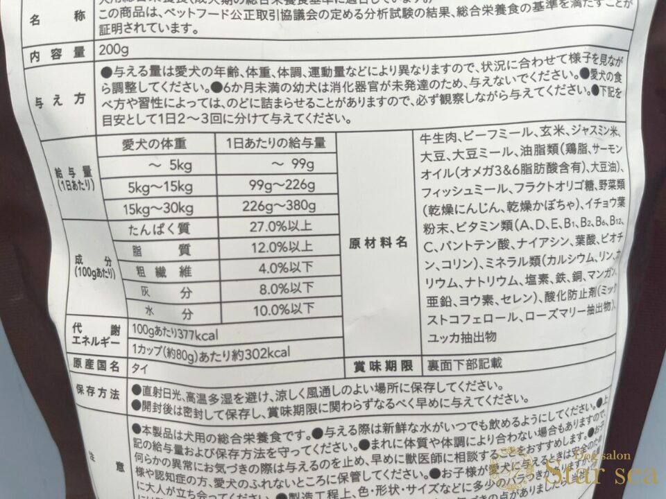 牛生肉、ビーフミール、玄米、ジャスミン米、大豆、大豆ミール、油脂類(鶏脂、サーモンオイル、大豆油)、フィッシュミール、フラクトオリゴ糖、野菜類(乾燥にんじん、乾燥かぼちゃ)、イチョウ葉粉末、ユッカ抽出物、ビタミン類、ミネラル類、酸化防止剤