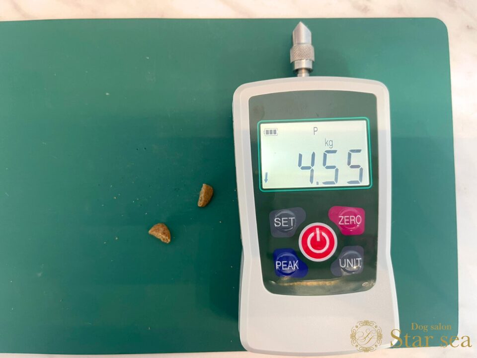 硬度測定器で粒の硬さを測ったところ、約4.5kgと平均的な硬さでした。