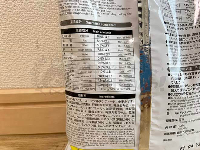 ダイソーのドッグフードについてネットでも調べたのですが、全然情報が出てきませんでした。仕方ないのでドッグフード裏面に書いてあることから読み取っていきます。