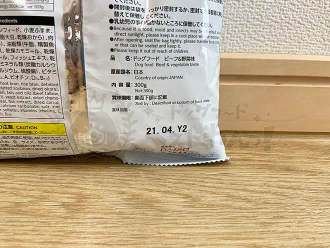 販売者の欄にはDAISO(株)大創産業と書かれています。これだけしかわかりません。どこでどのように作られているという情報が全くないので少し怖いですね。どこか別のドッグフードの会社にノウハウを聞いているのか、それともセブンイレブンのように製造者はまた別にいるのか、自社だけで全て製造しているのか謎は多いです。