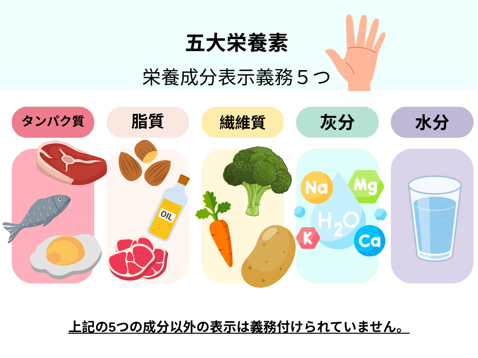 栄養成分の表記については「ペットフードの表示に関する公正競争規約」により、タンパク質、脂質、繊維質、水分、灰分の五大栄養素の含有量を表示するルールもあります。