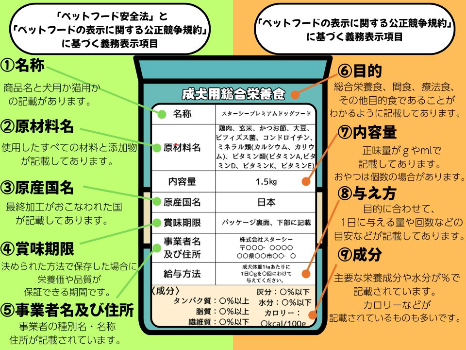 まず、農林水産省が定めるペットフード安全法」では、以下の5項目の表示が義務付けられています