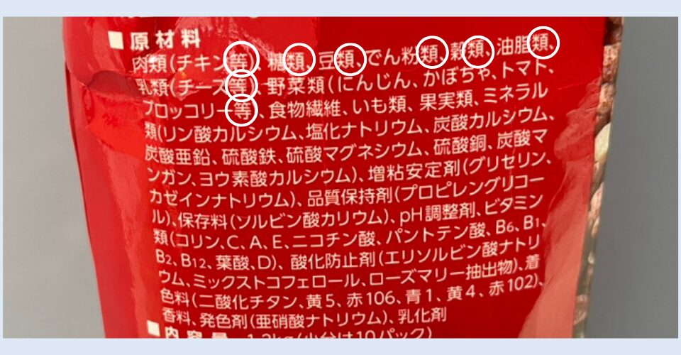 原材料名はペットフードに使用されている素材の多い順に並んでいますが、4番目の素材まではよく見ておくべきです。