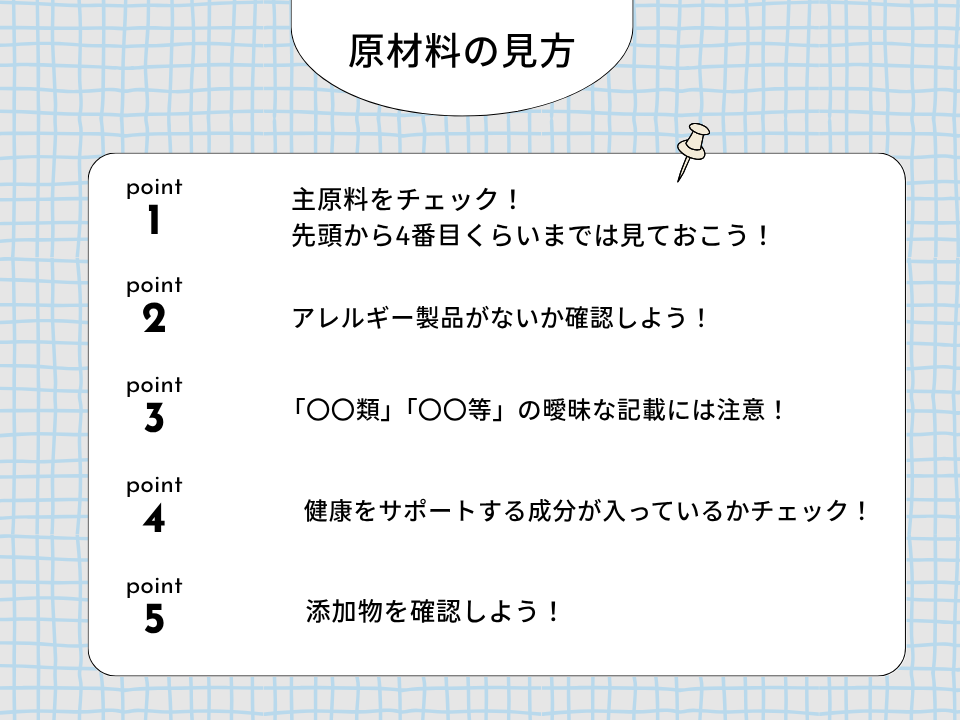 そこでここでは、原材料の見方のポイントや、できれば避けたい食材・添加物について、項目ごとにわかりやすく解説していきます。