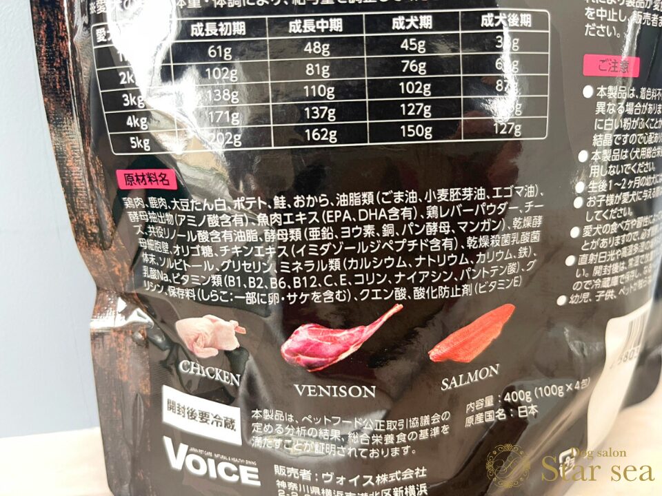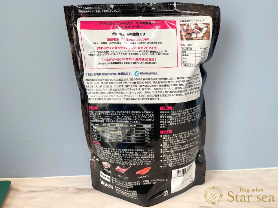 今回は「ドッグヴォイスオールステージ(全年齢用) 100g×4袋」を実際に購入し、調査しました。