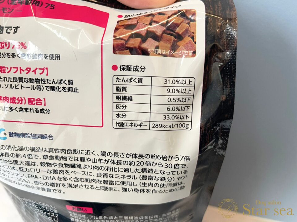 さらに、このフードはセミモイストタイプでカロリーが289kcal/100gと低めのため、通常のドライフードよりも多めの量を与える必要があります。