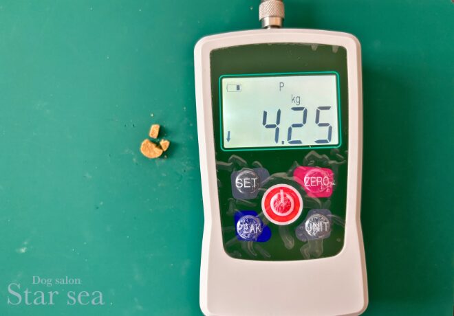 粒の硬さを測る専門の機械で測定した結果、一般的なドッグフードの平均的な硬さであることがわかりました。