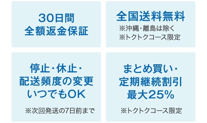 もちろん高品質なので、それなりにコストはかかりますが、公式では初回に試しやすいように全額返金保証を取り入れたり、定期コース(3袋トクトクコース)ではまとめ購入で最大23%OFFの割引が適用されるので、上手利用してお得に続けてみてくださいね。