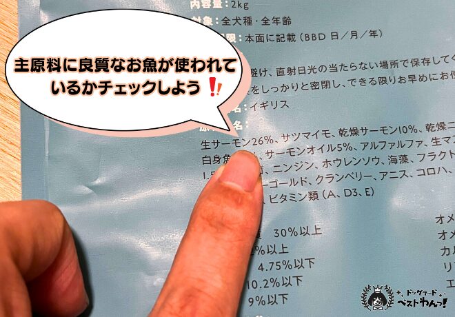 原材料の一番先頭の食材が「サーモン」「タラ」「白身魚」など、魚の名称が具体的に記載されているドッグフードを選びましょう。