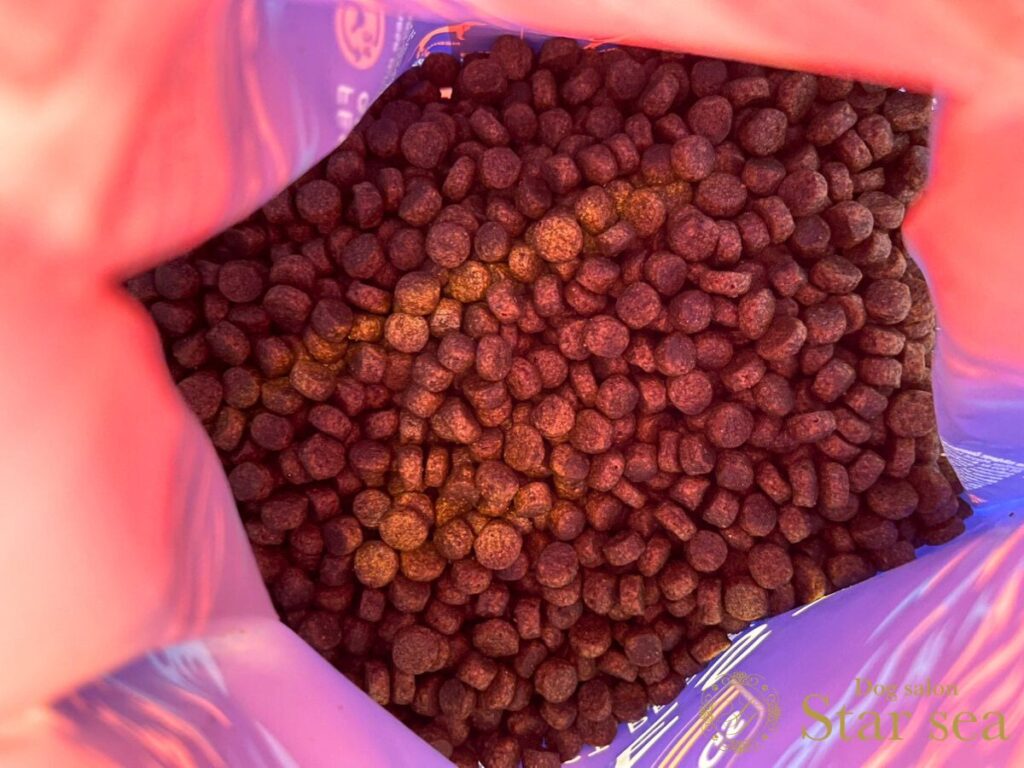 封を開けると魚の香りが強く漂い、手に取るとドッグフード特有のほんのりとした油っぽさが感じられます。