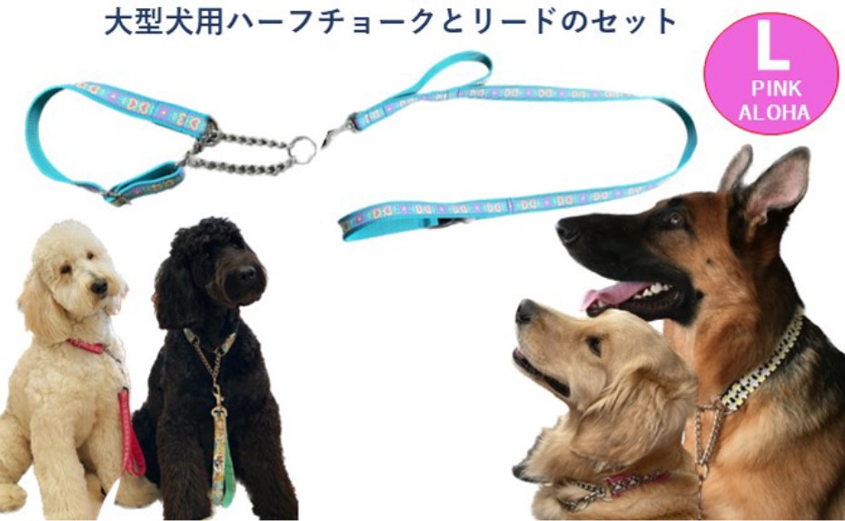 大型犬向けに作られた首輪は、引っ張りすぎても首に負担がかからないハーフチョーク仕様。リードとセットで、手作りの温かみが感じられるデザインもポイントです。