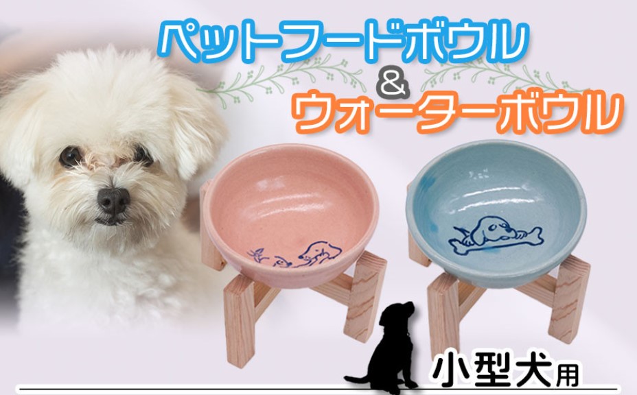 ふんわりとした絵柄が入ったボウルは、どんなお部屋にも馴染むデザイン。小型犬が食べやすい高さに木製の台座が付いているのも嬉しいポイントです。