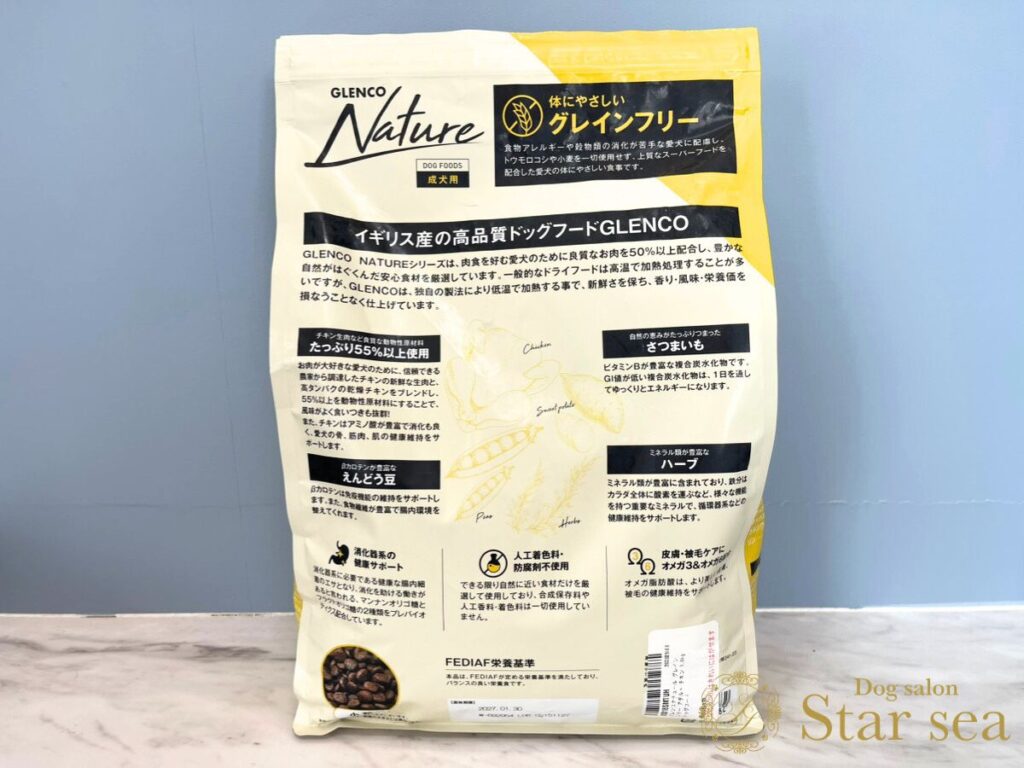 グレンコナチュールドッグフードは、グレインフリーなので「うまか」よりも消化に優しくアレルギーを持つワンちゃんに安心して与えられるフードですね。