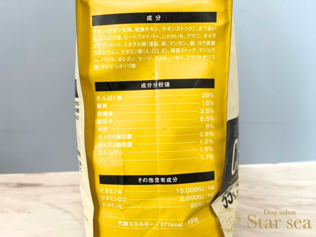 ※今回は「グレンコナチュール グレインフリー アダルトチキン 小粒」の表記です。