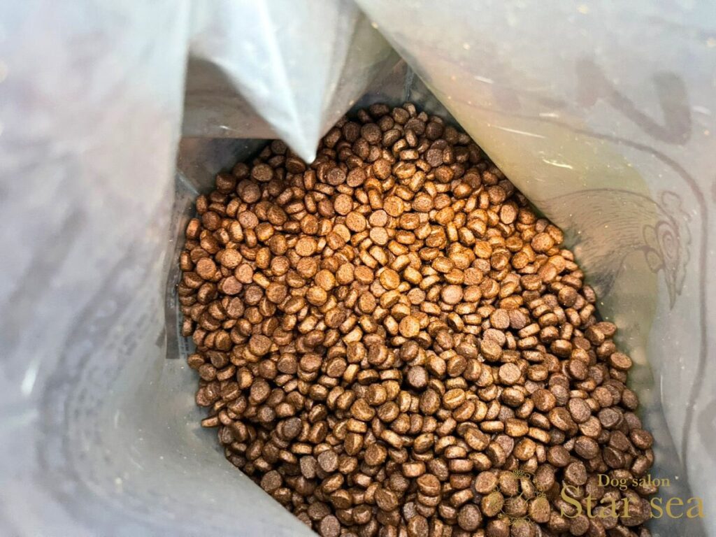 見た目はツヤがありますが、ドッグフード特有の粉っぽさや油っぽさは少なめです。