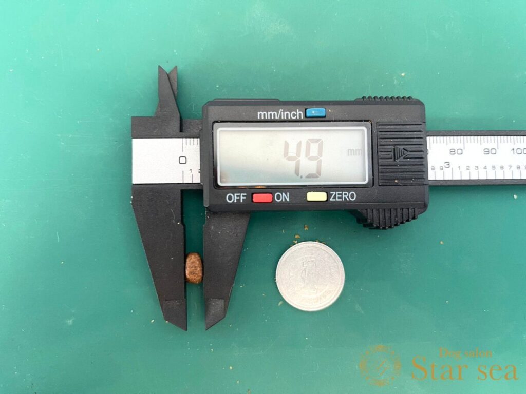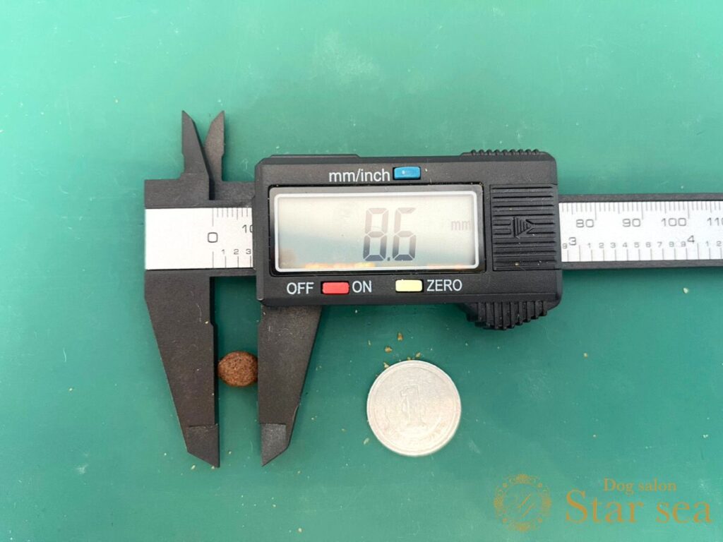 グレンコナチュールドッグフードの大きさは8.6㎜、幅は4.9㎜と小粒なことがわかります。