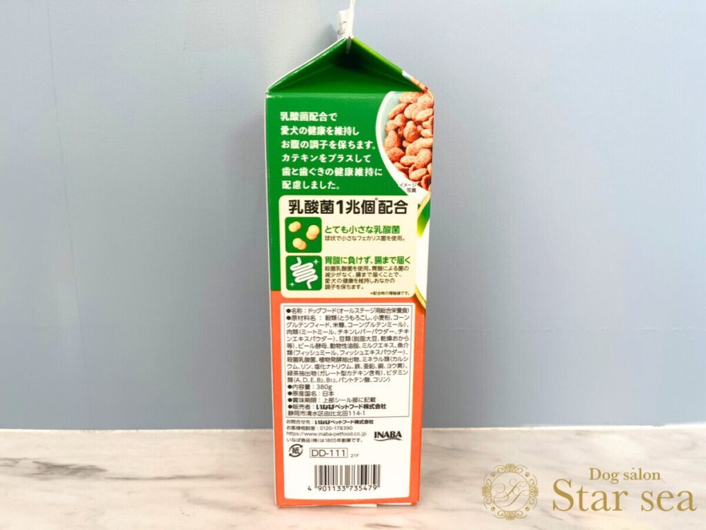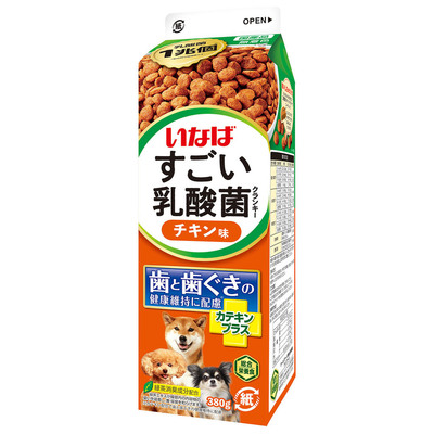 ※今回は「いなば すごい乳酸菌クランキー 牛乳パック チキン味 380g」の表記です。