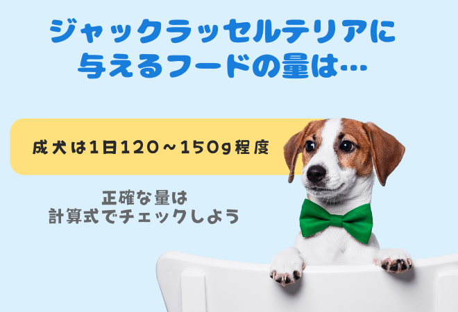 愛犬の体重や体格、ドッグフードのカロリーによっても変わりますが、成犬のジャックラッセルテリアに与えるドッグフードの量は「1日120~150g程度」が目安です。