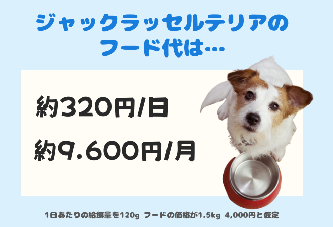 1日あたりの給餌量を120g、フードの価格が1.5kg4,000円と仮定すると、1日あたりのジャックラッセルテリアの餌代は約320円、1ヶ月では約9,600円かかります。
