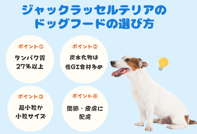 ここでは、そんなジャックラッセルテリアのために重視したいフード選びのポイントを4つ紹介します。