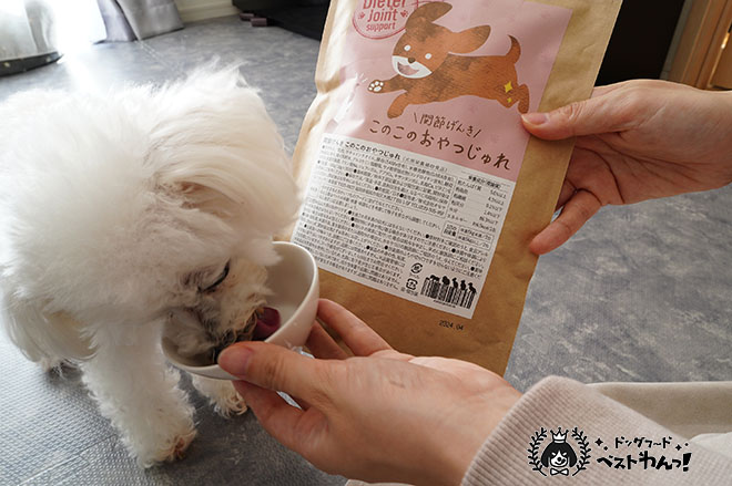 おやつタイプなどの関節サプリでは、小分けされた袋を開封してそのまま与えられる商品もあり、手間がかかるもの、簡単に与えられるものがありました。
