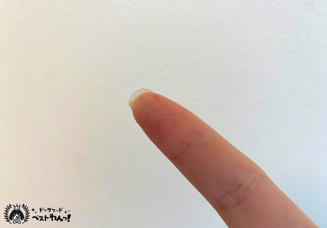 実際にカークランドの粒を1粒だけ触ってみると、以下の画像のように指に粉がまとわりつきました