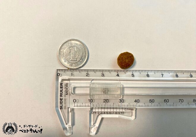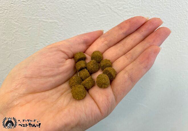 粒の大きさは約1センチほどです。厚みもあるので、顎の小さい小型犬や歯のトラブルがあるシニア犬は食べるのが難しいかもしれません。