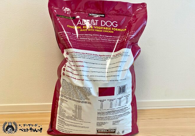 今回購入したカークランドの種類は「スーパープレミアムドッグフード 成犬用 12kg(チキン,ライス,ベジタブル)」になります。