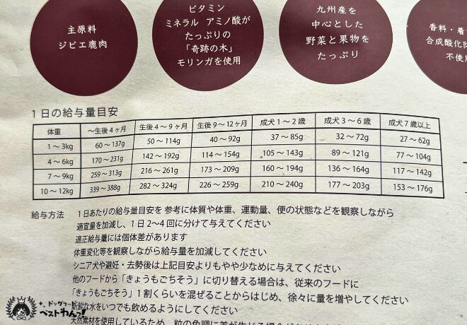 きょうもごちそうドッグフードの1日あたりの給与量目安