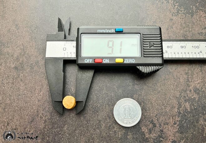 きょうもごちそうの粒は丸型をしており、粒の大きさを測定すると直径9.1ミリでした。