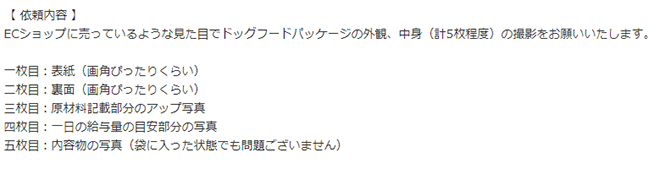 実際にドッグフードを買っておらず、ランサーズやクラウドワークスで依頼してドッグフードのパッケージを撮影してもらっている人もいます。私が見たなかではこのような依頼がありました。
