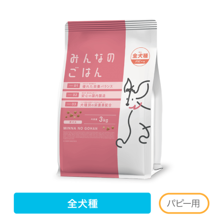 | パッケージ | ![]() みんなのごはん 全犬種用 パピー用 | みんなのごはん 全犬種用 アダルト用 | みんなのごはん 全犬種用 シニア用 |