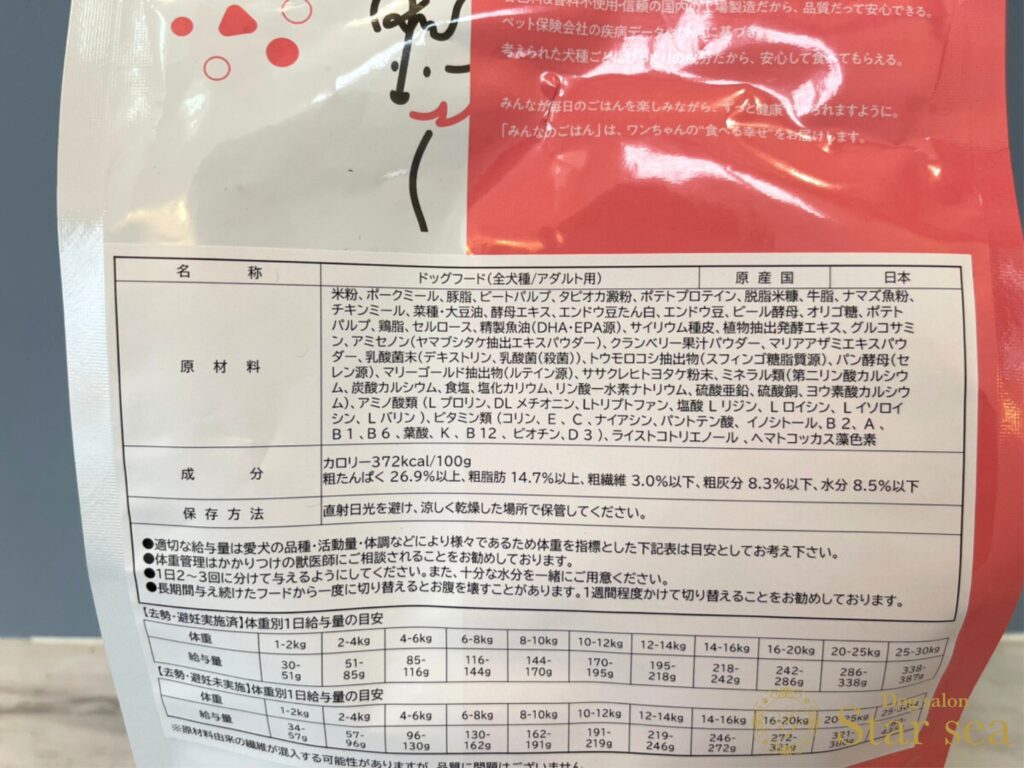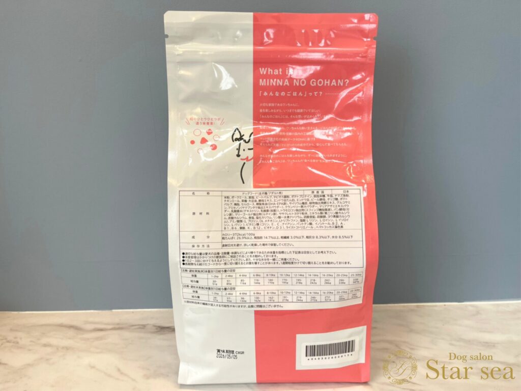※種類によって異なります。今回は「みんなのごはん全犬種用アダルト用」の表記です。