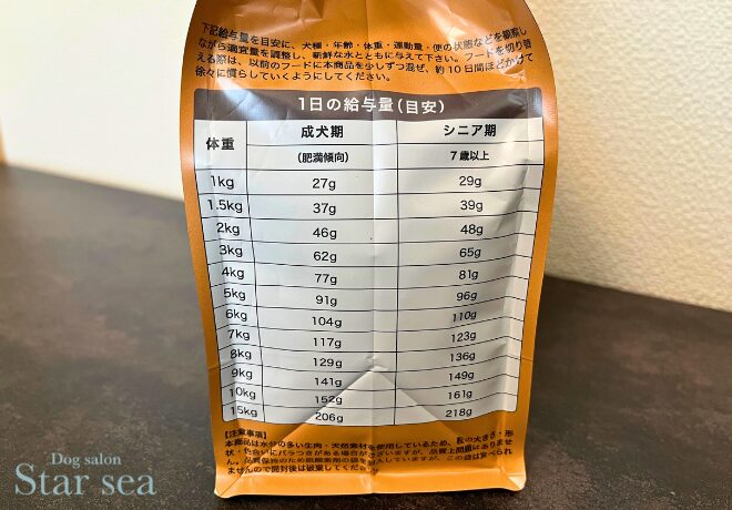 ミシュワンシニア犬用の1日あたりの給餌量の目安はパッケージの側面に記載されています。