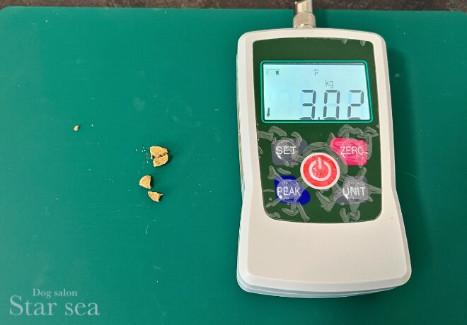 粒の硬さを専門の機械で測定したところ、一般的なドッグフードよりも弱い力で砕くことができる数値でした。