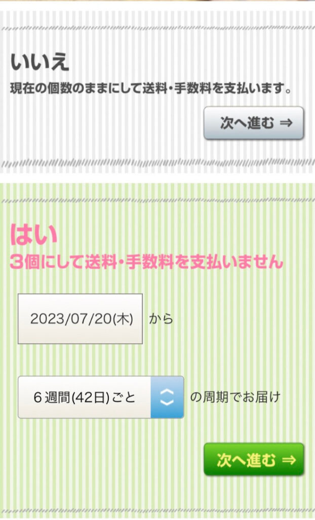 この時に下の「はい」の方、緑色の「次に進む」を押してしまうと自動的に3個注文に変更されてしまいます!