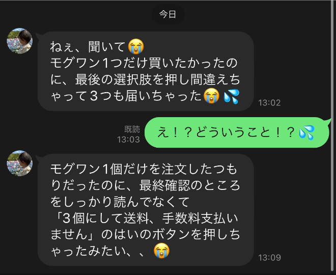 話を聞いたところ、もちろんモグワンに騙された!というわけではなく、選択肢を押し間違えてしまったようです。