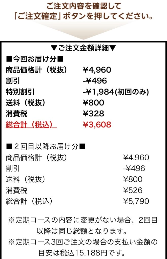 特別初回割引が適応になっていることを確認し、ご注文確定ボタンを押せば注文完了です!